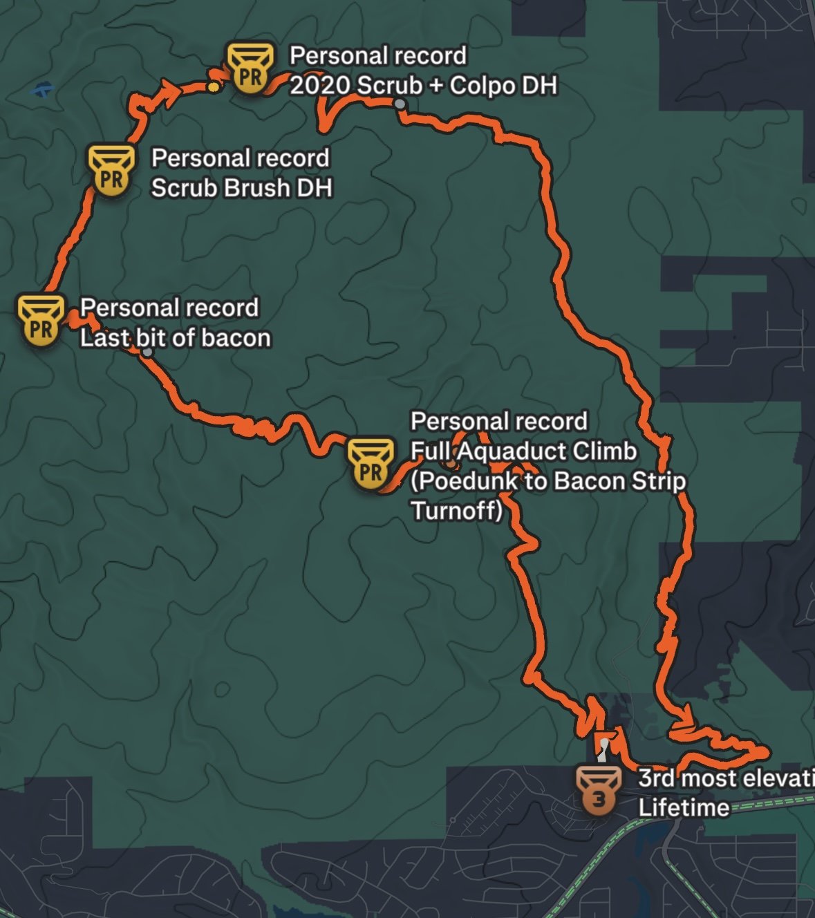 Rode Poedunk, snow terrace, bacon strip to the third bench and over to calpo canyon, stagecoach then to UNR downhill and Reno Vista. All were dry. Deep ruts upper stagecoach.
